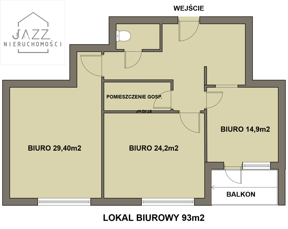 Trzy oddzielne pokoje o powierzchni 29,4 m2, 24,2 m2 oraz 14,9m2.